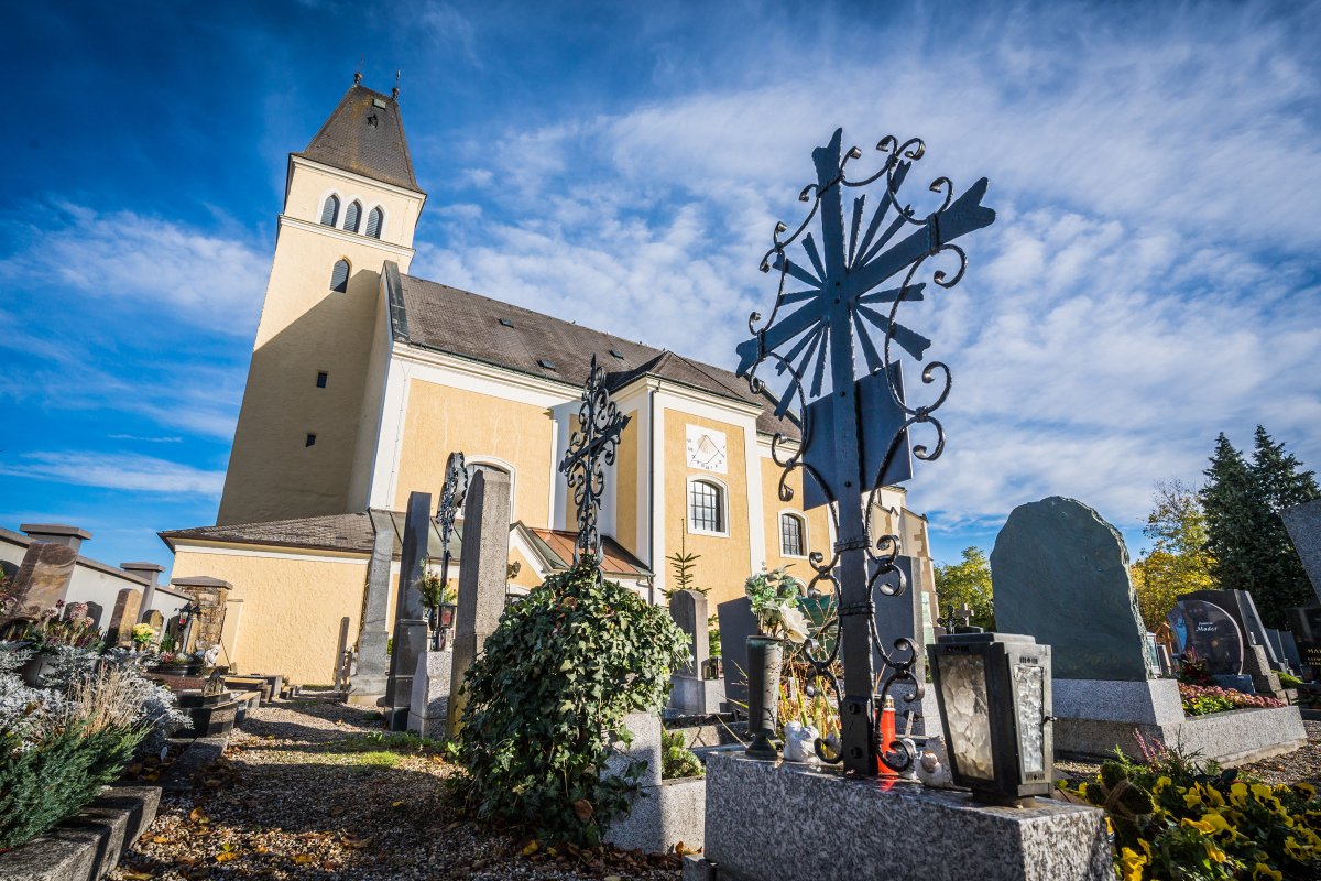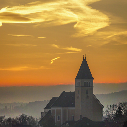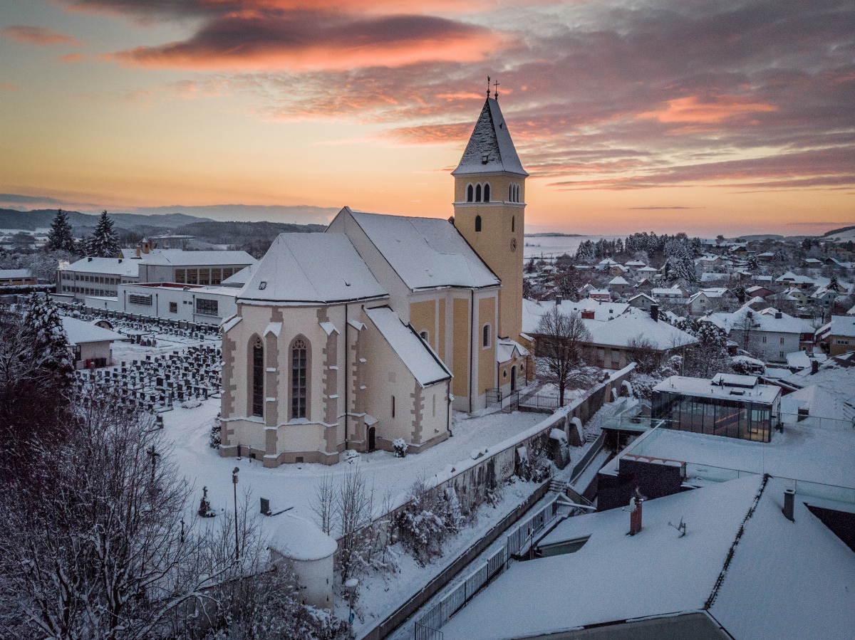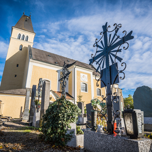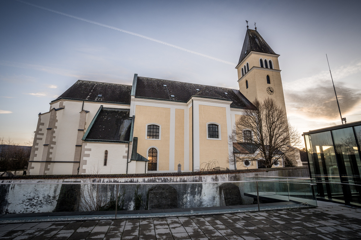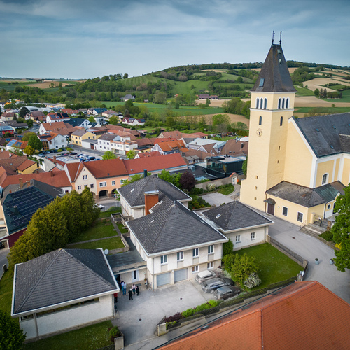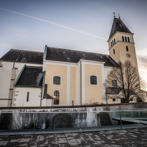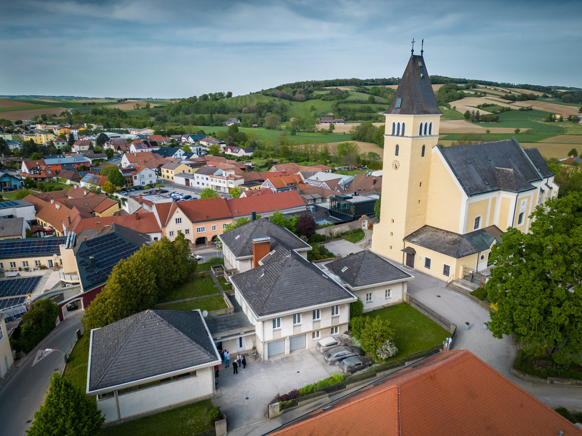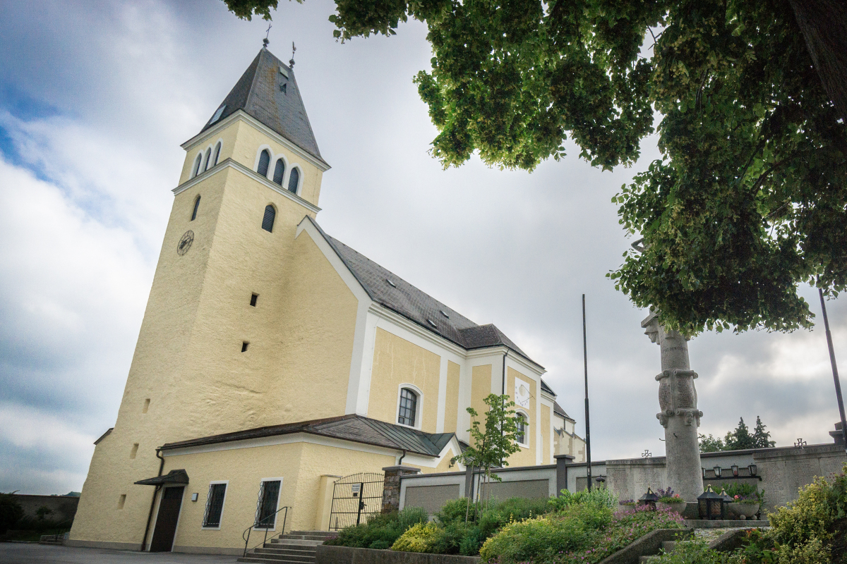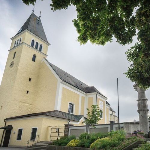 Die ehemalige Wehrkirche, die über dem alten Markt thront, hat auf dem selben Platz Vorgängerbauten. Die Wehrmauer und die Wehrturmreste mit Schlüsselscharten bezeugen dies noch. Das erste Bethaus wurde wahrscheinlich von den ackerbauenden 'Boemani', die den vordringenden Awaren in unserm Raum folgten, errichtet. In der ersten Urkunde über den Pfarrort aus dem Jahre 985 bestätigte Otto III. (980-1002) dem Bistum Passau die Liegenschaften, die während der Magyareninvasion verlustig gingen. Das Pfarrgebiet war bereits in 9. Jhdt. Passauer Besitz gewesen.