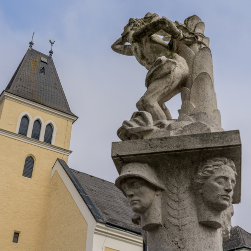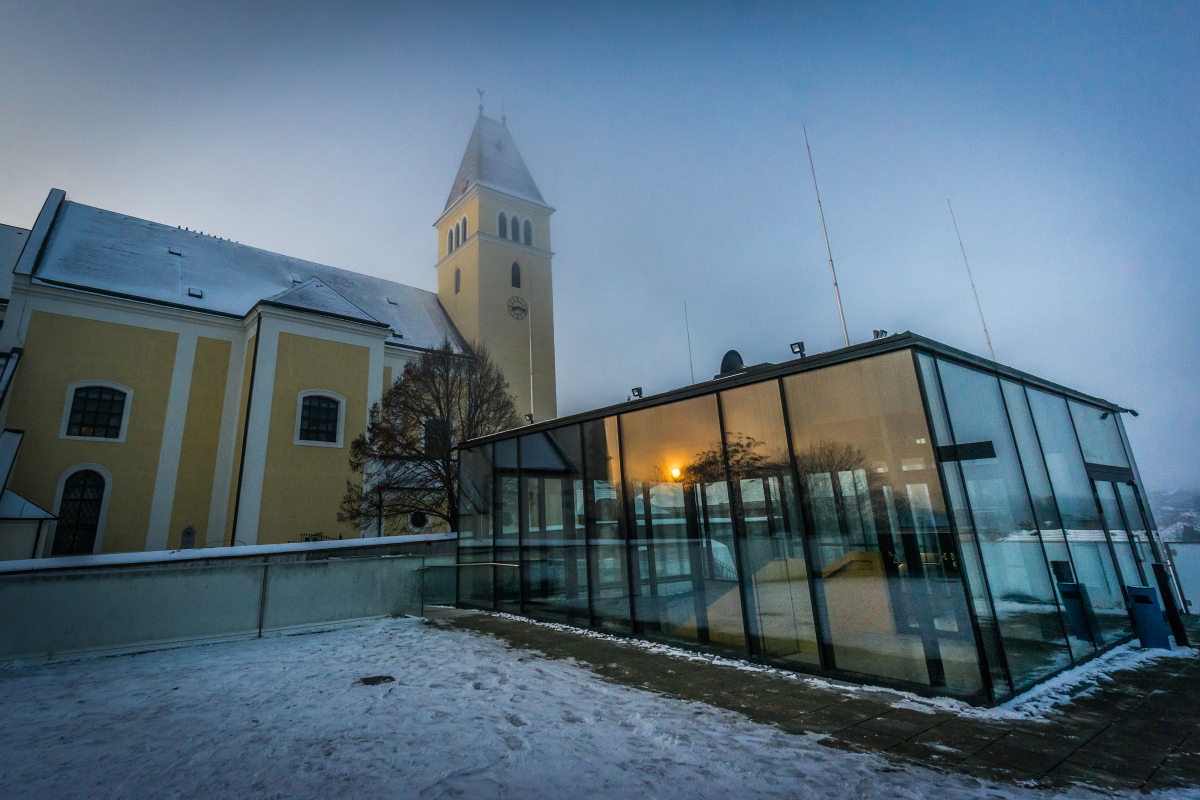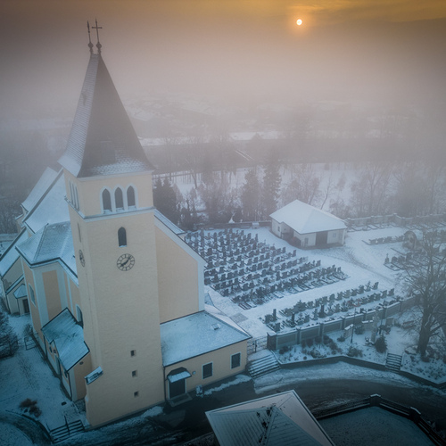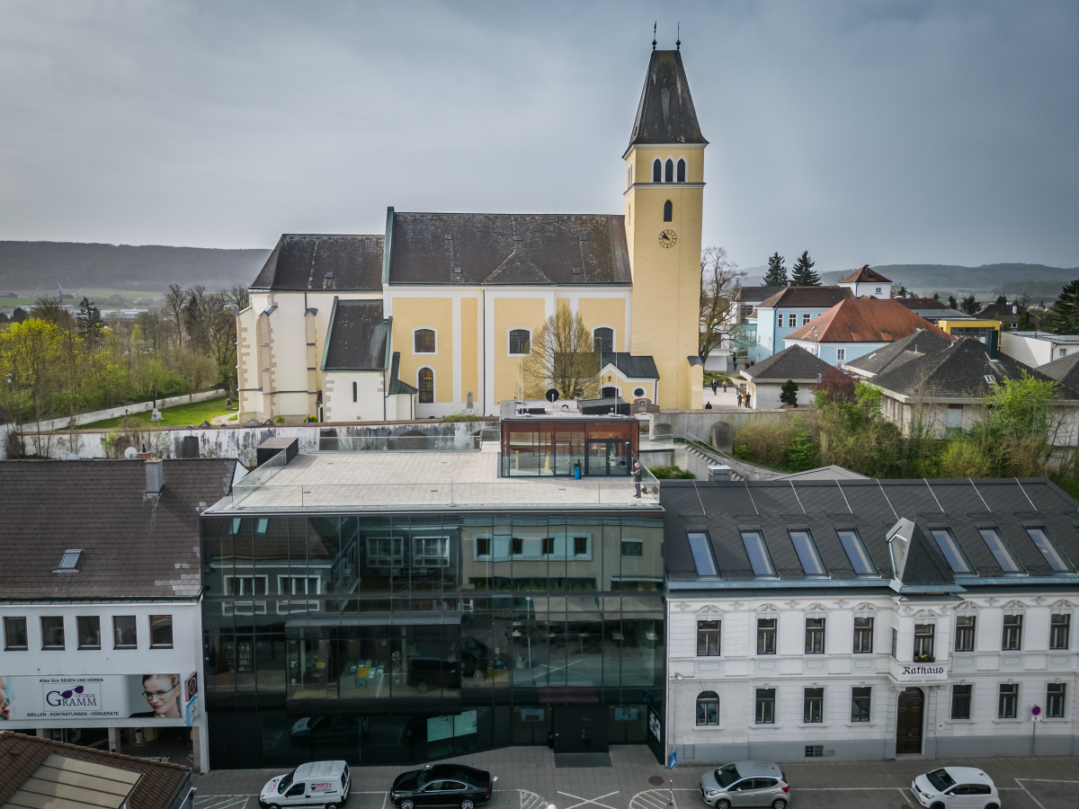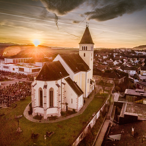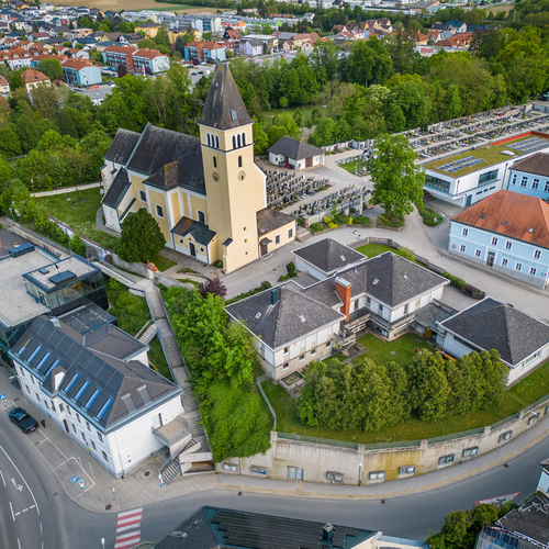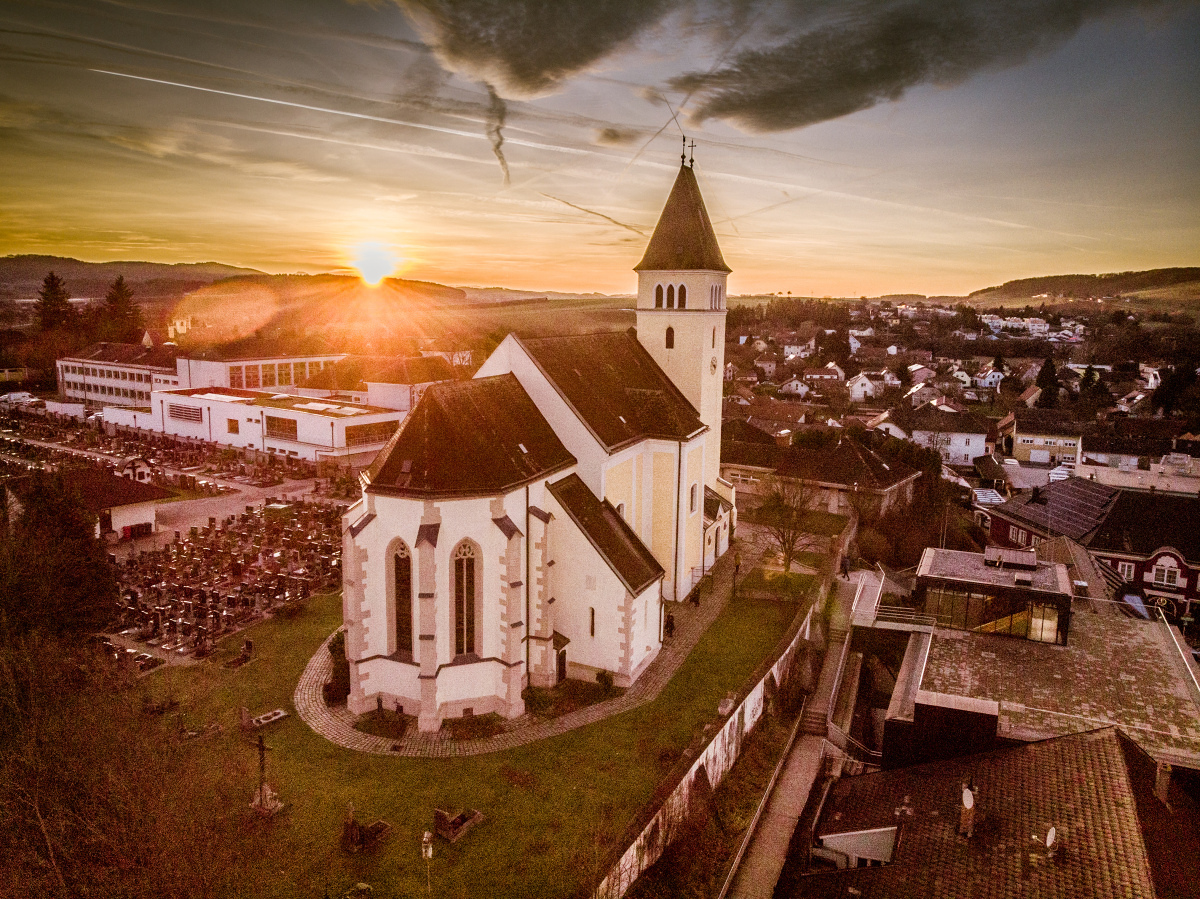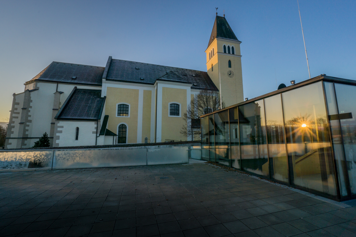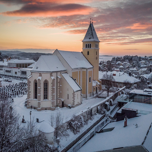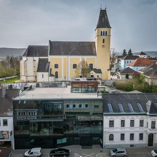 Die ehemalige Wehrkirche, die über dem alten Markt thront, hat auf dem selben Platz Vorgängerbauten. Die Wehrmauer und die Wehrturmreste mit Schlüsselscharten bezeugen dies noch. Das erste Bethaus wurde wahrscheinlich von den ackerbauenden 'Boemani', die den vordringenden Awaren in unserm Raum folgten, errichtet. In der ersten Urkunde über den Pfarrort aus dem Jahre 985 bestätigte Otto III. (980-1002) dem Bistum Passau die Liegenschaften, die während der Magyareninvasion verlustig gingen. Das Pfarrgebiet war bereits in 9. Jhdt. Passauer Besitz gewesen.