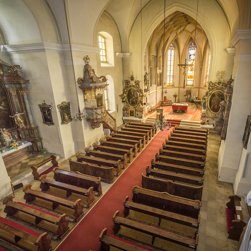 1518 wurde der gotische Chor und die Sakristei gebaut. 1529 verwüsteten türkische Streifscharen die Kirche. In der Landesbeschreibung des Jahres1558 wird der Kirchenbau als 'oed und abgeprannth' ausgewiesen. 1683 legten die 'Renner und Brenner' Kirche und Markt in Schutt und Asche. Von 1731 bis 1734 erfolgte die Erweiterung des Langhauses auf die gegenwärtige Größe unter dem Propst Michael Führer. Über den Portalen der Seitenausgänge weisen die Jahreszahlen 1734 auf den Bauabschluss hin. Die Ausstattung mit Werken der Malerei und Plastik erfolgten im Anschluss aus Beständen aufgehobener Klöster. Die Heimsuchungen französischer Truppen in den Jahren 1805 und 1809 hinterließen auch ihre zerstörerische Handschrift. Die barocke Empore (Sänger- und Musikerchor) wurde in der 2. Hälfte des 19. Jhdts. erweitert.