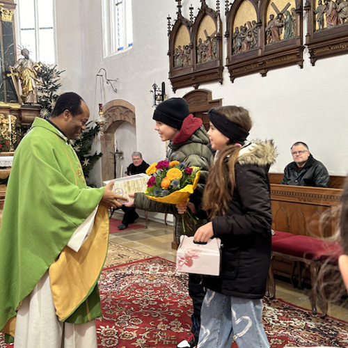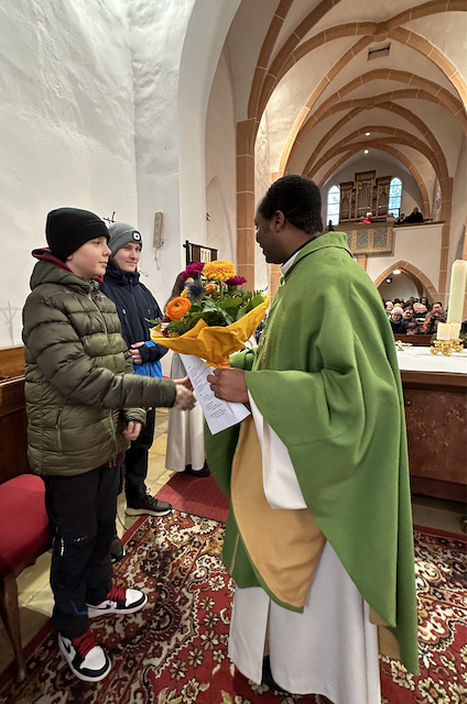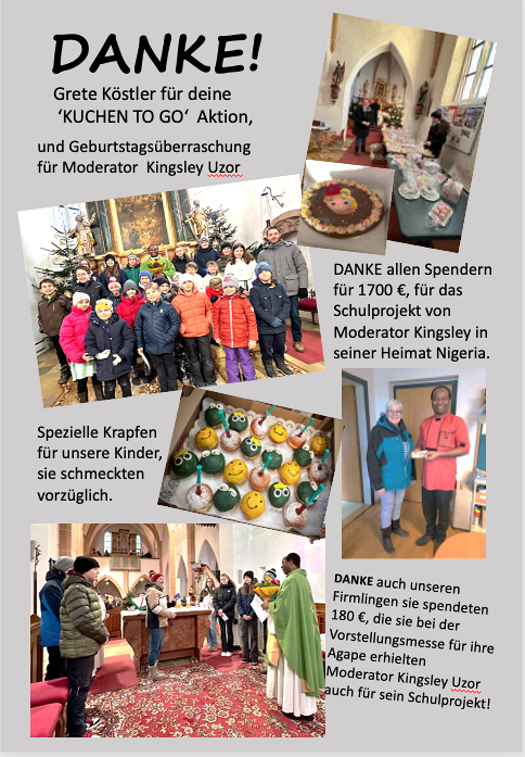 1700 € Spenden für Kingsley Schulprojekt in seiner Heimat. Außerdem übergaben die Firmlinge ihr Spenden von €180, die sie durch ihre Agape bei der Firmvorstellmesse erziehlt haben. Herzlichen Dank an alle für diese schöne, gemeinsame Familienmesse!