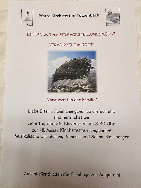 Am 26.11.2023 luden die Firmlinge aus unserer Pfarre zu ihrer Vorstellungsmesse unter dem Motto: „Verwurzelt in Gott, verwurzelt in der Familie“ ein. Musikalisch umrahmt mit fröhlichem Gesang von Selina und Vanessa Hiessberger wurde es zu einer besinnlichen Messe für die vielen Messbesucher. Anschließend luden die Firmlinge zu einer Agape. Ihre Spenden von € 180 übergebn die Firmlinge unseren Pfarrer für sein Schulprojekt in seiner Heimat.